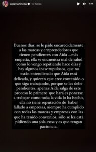 "Buenos días, pedimos sinceras disculpas a las marcas y empresarios que tienen asuntos pendientes con Aida... Sean más empáticos, su salud es mala como lo he repetido durante días y hay algunos individuos que no entienden que Aida es sensible", señaló Adolfo. al principio.