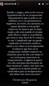 Al final, Adolfo Carrasco destacó que la figura pública tuvo que someterse a varias operaciones para recuperarse. “Si alguien quiere verlo es sólo para hacerle pasar un buen rato, repito, una cosa negativa en su mente puede ser catastrófica para su recuperación y aún quedan muchas intervenciones por hacer”, concluyó su comunicado.