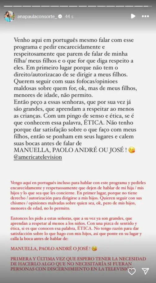 "Vengo aquí en portugués incluso para dirigirme a este programa y pedirles encarecidamente y con respeto que dejen de hablar de mi hija/mis hijos y todo lo que les concierna. En primer lugar, porque no tienen derecho/autorización para mencionar a mis hijos. Si quieren seguir con sus chismes/opiniones malintencionadas sobre quien sea, está bien, pero no permitiré que lo hagan sobre mis hijos, que son menores de edad", escribió Ana Paula.
