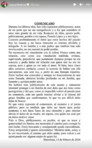 “Ya no hablaré públicamente de este asunto y sólo intentaré proteger a mi familia de este daño, del cual soy protagonista y cuya comisión sólo puedo hacer yo, ya que es imposible volver al pasado para evítelo. “Intentar desahogar el interior del grupo familiar que nos compone”, lo cual, aunque difícil, no conviene dejar de buscar. Sé que estoy sujeto a comentarios, burlas y juicios públicos; "Pero también sé que tengo que ser fuerte para mantener a mis hijos fuera de esta situación y tratar de aliviar el dolor de su madre, mi esposa, con la que me casé por una sola razón: el amor", afirmó.