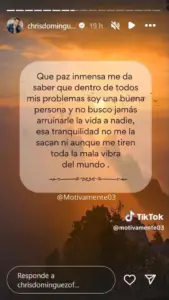 “Que inmensa paz me da saber que a pesar de todos mis problemas soy una buena persona y nunca intento arruinarle la vida a nadie, esa tranquilidad no me la quitarán aunque me echen todas las malas vibras del mundo”, dice el texto que publicó Domínguez.