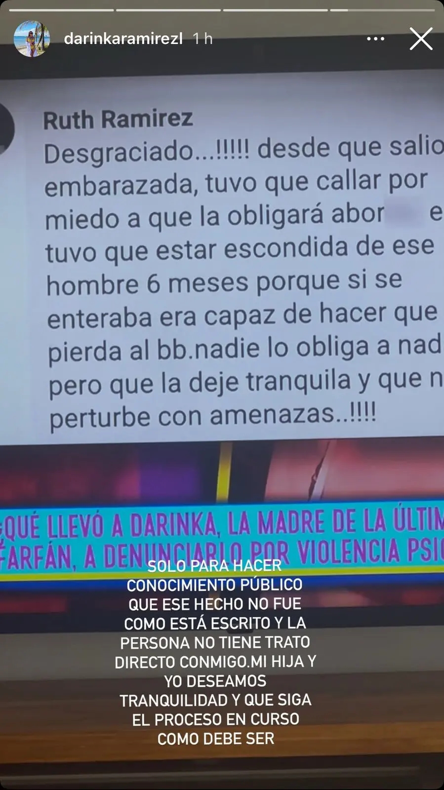 En sus historias de Instagram, Darinka se refirió de manera directa a las declaraciones de esta familiar, quien había afirmado que la joven se habría visto obligada a esconderse durante su embarazo por miedo a que Farfán la presionara para interrumpir su gestación. Este comentario causó revuelo, pues implicaba una situación de alto estrés y angustia emocional que Ramírez desmintió de forma tajante.