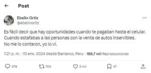 La actriz peruana no dudó en hablar de este tema en su cuenta "X": "Es fácil decir que cuando te pagan por el teléfono, hay una oportunidad. Cuando estafas a la gente vendiendo autos chatarra. "No me dijeron que lo vi con mis propios ojos".