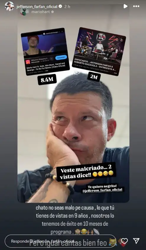 Sin embargo, la respuesta de Farfán no se hizo esperar. El exjugador de Alianza Lima, conocido por su estilo directo y sin filtros, publicó un mensaje sarcástico en su cuenta de Instagram para responderle a Hart: “'Chato', no seas malo pe’ causa, lo que tienes de visitas en 9 años, nosotros lo tenemos de éxito en 10 meses de programa. ¡Pero igual cantas bien feo!”, comentó con su característico tono de burla.