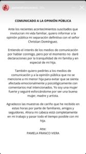 “A la luz de los recientes acontecimientos en mi vida familiar, quisiera informar al público sobre mi separación definitiva del señor Christian Domínguez. Entiendo el interés de los medios de comunicación en hablar conmigo, pero no haré ninguna declaración por el momento por la tranquilidad de mi familia y en especial de mi hija", señala el comunicado.