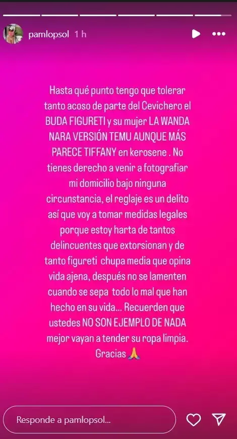 La influencer relató que estas personas no solo acudieron hasta la puerta de su vivienda sin ninguna justificación, sino que además habrían tomado fotografías de los alrededores del inmueble, lo cual fue interpretado por ella como una forma de vigilancia o incluso intimidación. En sus publicaciones, Pamela se mostró visiblemente molesta y expresó su indignación frente a lo que considera un claro caso de acoso.