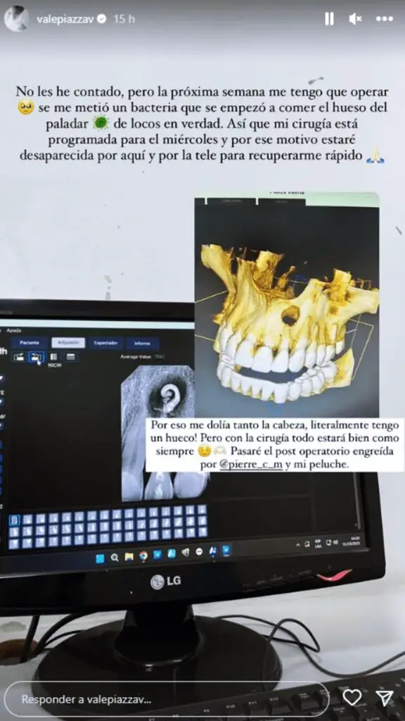 "No te lo he dicho todavía, pero me operarán la próxima semana. Una bacteria entró en mi cuerpo y comenzó a comerse los huesos de mi boca. "Realmente una locura", escribió Valeria.
