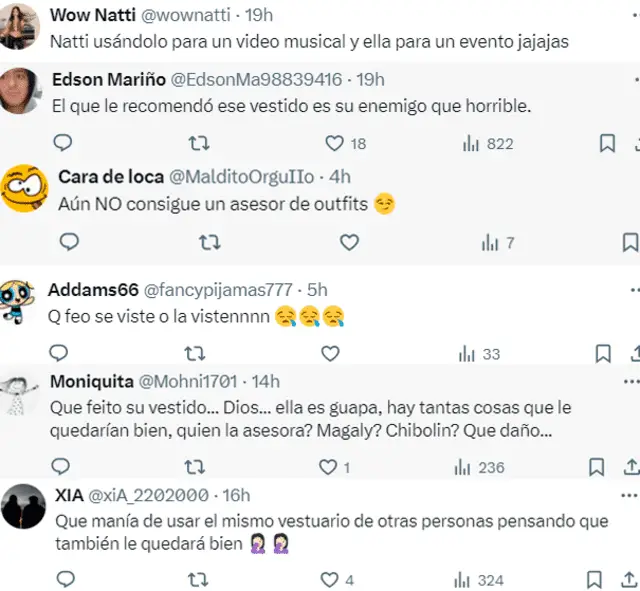 Los comentarios de los usuarios en línea incluyeron críticas como "Todavía no ha encontrado un asesor de moda", "Viste horrible o la visten horrible", "No tiene a nadie que le asesore en imagen y moda, siempre usa el mismo estilo y el color es fatal", "Es bonita, hay tantas cosas que le quedarían bien, ¿quién la está asesorando?", "Tiene la costumbre de usar el mismo vestuario que otras personas pensando que también le quedará bien".